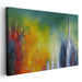 Introducing "Urban Inferno Calm," a mesmerizing cityscape canvas art that harmoniously fuses abstract expressionism with urban realism, capturing a skyline dominated by a towering skyscraper reminiscent of the iconic Burj Khalifa. The artwork portrays a dynamic cityscape enveloped in a swirl of colors, transitioning from a deep stormy green sky to a vibrant fiery foreground.