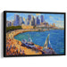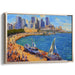 Beneath the city skyline lies a lively waterfront promenade teeming with people savoring a sunlit day. The artist's expressive brushstrokes infuse the scene with movement and vitality, particularly evident in the crowd engaged in various activities like strolling, conversing, and admiring the landscape. Two boats anchor near the shore, a sailboat with billowing sails and a motorboat, both meticulously detailed to capture the interplay of light and color.