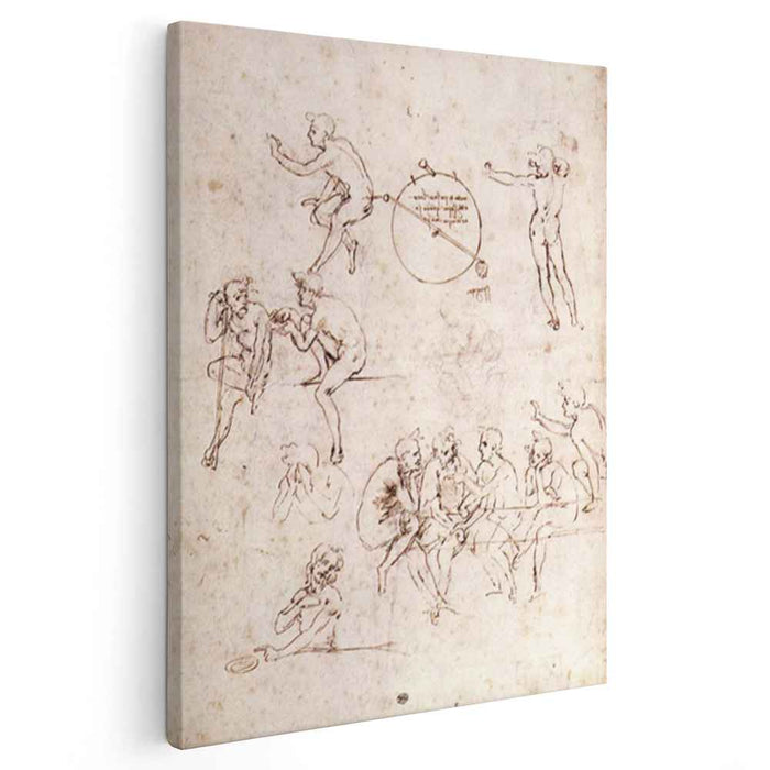 Unveiling the intricate details of Leonardo da Vinci's renowned series of figure studies, dating back to the 1490s, this meticulously reproduced canvas print offers a window into the Renaissance master's masterful study of human form and movement.