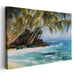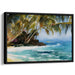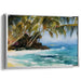 The foreground of this painting is adorned with a cluster of vibrant palm trees, their verdant leaves swaying gently in the coastal breeze, casting dappled shadows on the pristine sands. The rhythmic melody of the gentle waves caressing the shore adds a calming ambiance to the scene, while a hint of rocky outcrop provides a touch of natural ruggedness to the idyllic setting.