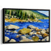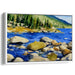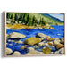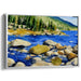 Introducing 'Verdant Serenity: Tranquil Blue Waters and Verdant Forest,' a captivating landscape canvas art that immerses viewers in the tranquil beauty of nature along a serene riverside. This mesmerizing artwork portrays a vibrant blue river meandering gently amidst an assortment of smooth, multicolored rocks, ranging from warm ochres to cool grays, creating a harmonious blend of hues.
