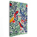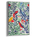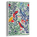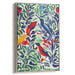 The canvas bursts with life as bold primary colors - deep blues, vibrant reds, and striking yellows - adorn the exotic birds, creating a striking contrast against the various shades of green that make up the dense foliage. The artist's technique, reminiscent of Henri Matisse's 'cut-out' style, uses broad, flat areas of color and simplified forms to infuse the composition with a sense of energy and motion.