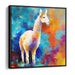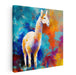 Step into the world of 'Vibrant Emotive Palette Splash: A Symphony of Color,' a vibrant canvas art print that radiates with a kaleidoscope of rich, dynamic hues and expressive flair. This masterpiece showcases a lone llama standing gracefully amidst a whirlwind of abstract colors, creating a mesmerizing visual feast for the eyes. The llama, depicted in soft whites and light browns, stands out strikingly against the backdrop of intense blues, fiery oranges, and warm yellows that dance energetically around it.