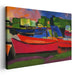 Introducing 'Vibrant Horizon Expressionism: Abstract Fauvist Sunset,' a mesmerizing canvas art print that captures a serene harbor scene with a contemporary and abstract twist. This dynamic artwork immerses viewers in a tranquil harbor setting, featuring vibrant and bold red and blue boats that command attention against a backdrop of lush green trees and a deep blue sky merging into a warm, glowing sunset painted in rich hues of orange and pink.
