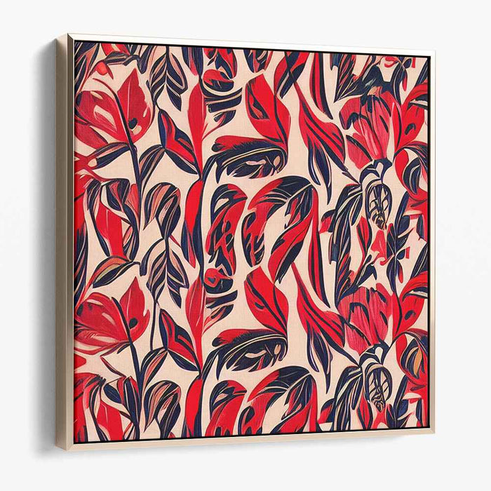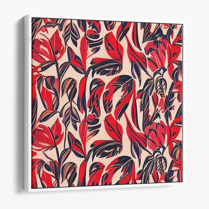 Introducing 'Vibrant Leaf Waltz: Energetic Foliage Dance,' an electrifying canvas art print that mesmerizes viewers with its swirling leaf motifs dancing in a rhythmic, organic symphony across the canvas. This captivating artwork boasts a rich and vibrant palette dominated by shades of crimson red, deep navy blues, and delicate hints of white, creating a visually dynamic and engaging composition.