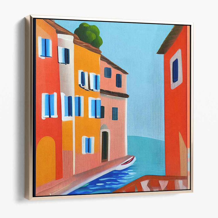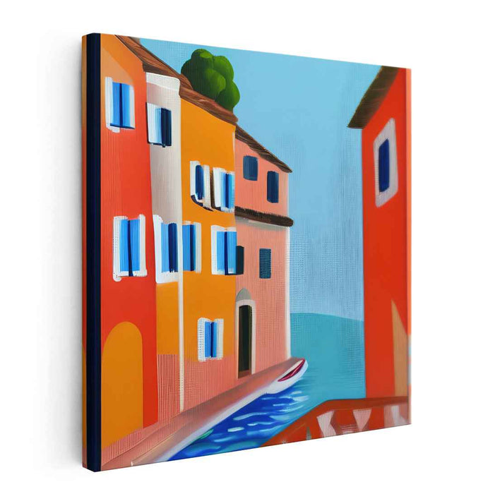 Introducing 'Vibrant Mediterranean Streetscape,' a captivating canvas art print that transports you to a charming Mediterranean coastal town drenched in sunlight and vibrant colors. This contemporary artwork showcases a picturesque alleyway lined with buildings painted in warm tones of orange, red, and yellow, drawing the eye towards the tranquil azure sea.