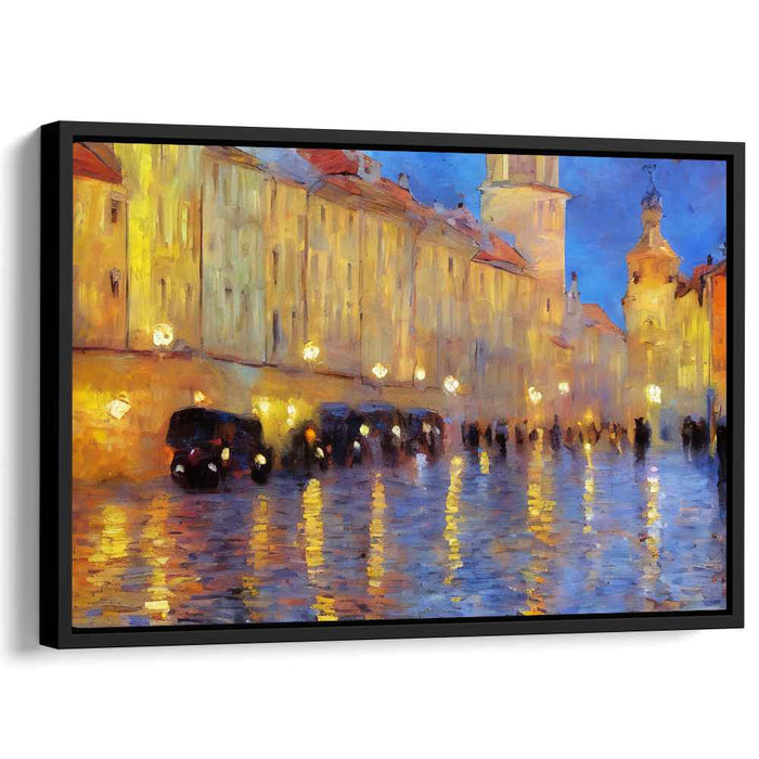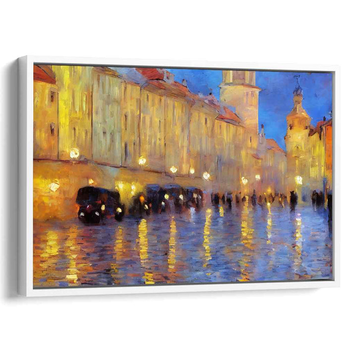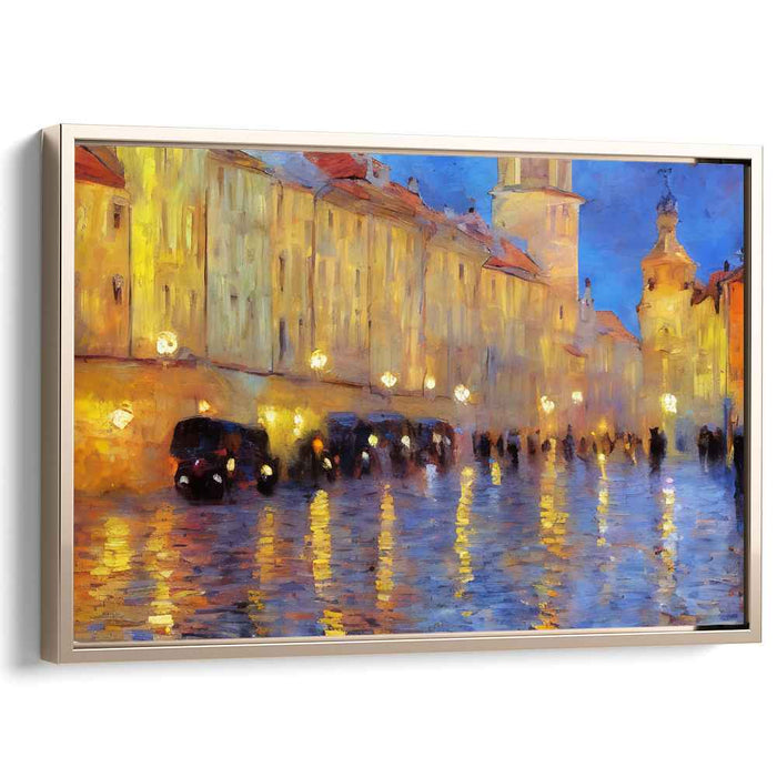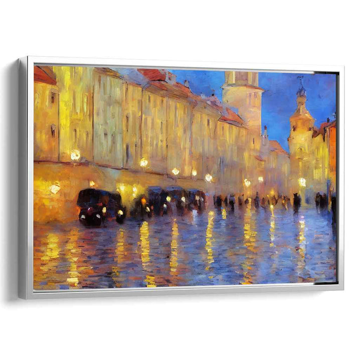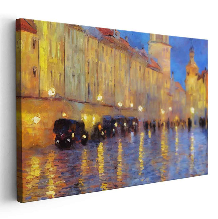 Introducing 'Vintage Rain Dance: A Rainy Evening in the Old Town,' a captivating canvas art print that transports viewers to a bustling urban street immersed in the enchanting ambiance of a rainy twilight. This masterful artwork depicts a picturesque scene where the glistening cobblestone street mirrors the warm, golden radiance of street lamps, creating a mesmerizing play of light and shadow that infuses the composition with depth and vibrancy.
