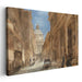 Introducing 'Vintage Village Mosaic: A Glimpse into Historic European Charm,' a mesmerizing landscape canvas art that transports viewers to a sunlit street in a historic European city, where classical architecture and daily life harmoniously converge. This captivating artwork captures a majestic domed building in the background, reminiscent of grand cathedrals or governmental edifices, surrounded by towering, intricately detailed structures.