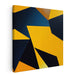 The composition features large, angular shapes in a striking yellow hue that play dynamically against deep navy blue and black segments. The minimalist approach of the artist focuses on the fundamental elements of shape and color, creating a visually stimulating effect that invites viewers to explore the intricate relationships between the forms.