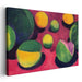 The artist's palette is a celebration of vibrancy, with dominant hues of rich greens and yellows dancing against a deep magenta backdrop. This bold color choice creates a visually stimulating contrast that not only captures the eye but also infuses the artwork with energy and vitality. The clever play of light and shadow adds depth, lending a three-dimensional quality to the spherical objects and enhancing their realism.