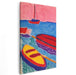 The foreground of the artwork showcases three boats painted in bold shades of red, yellow, and blue, standing out against the serene waters that reflect the dreamy pink sky above. In the background, a larger sailboat adds depth to the composition, its slightly blurred form enhancing the sense of perspective and distance.