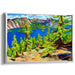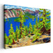 Introducing the captivating "Vivid Skyline Canvas," a vibrant landscape canvas art print that transports viewers to a majestic mountainous lake setting, brimming with natural splendor and tranquility. This striking artwork focuses on a deep blue lake, encircled by rugged cliffs and verdant pine trees, meticulously brought to life with bold brushstrokes and a rich color palette.