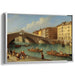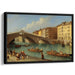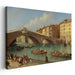 The artwork features a prominent stone bridge dominating the scene, surrounded by buildings painted in warm ochres and browns that contrast beautifully with the cool blues and greens of the water and sky. The artist's attention to detail is evident in the bustling activities along the canal, from merchants selling their wares to gondoliers gracefully navigating their boats through the tranquil waters.