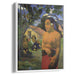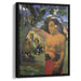 The painting's central figures, a young woman and child, are poised amidst a lush, tropical landscape. Their enigmatic expressions and the symbolic objects surrounding them invite contemplation. The woman holds a flower, a symbol of beauty and transience, while the child carries a basket of fruit, representing sustenance and fertility. Together, they embody the cycle of life and the connection between humanity and nature.