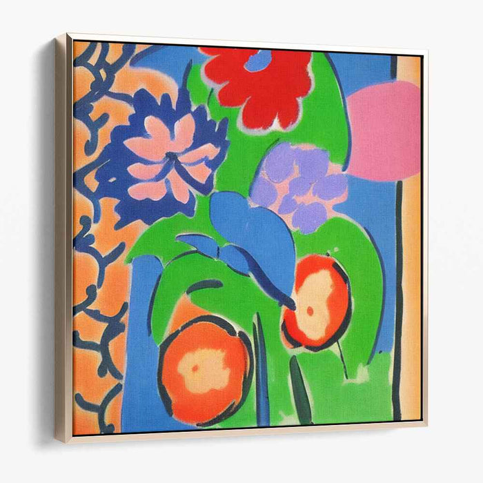 The flowers depicted in this piece exude a sense of energy and vitality, with their petals brought to life through expressive, sweeping brushstrokes that convey a feeling of motion and liveliness. The background, a brilliant blue, serves as a bold contrast to the warm oranges and pinks that frame the edges, adding depth and richness to the overall composition. The artist skillfully blends bold outlines with softer, gradient transitions, a technique reminiscent of the Fauvist movement, to create a harmonious balance between structure and fluidity, intensifying the emotional impact of the artwork.