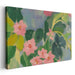 The artwork showcases a rich composition of vibrant pink flowers delicately intertwined with verdant foliage, creating a visually stunning contrast against the soft, blended hues of blues and greens in the background. The primary color, a lively green, symbolizes growth and renewal, while the pink blossoms infuse the scene with warmth and romance. Secondary colors like various shades of blue and subtle hints of yellow enrich the overall visual tapestry, elevating the viewing experience to a new level of appreciation.