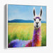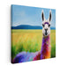 Introducing 'Whimsical Rainbow Llama in Blooming Field,' a captivating fantasy canvas art print that transports viewers to a world of vivid imagination and joy. This enchanting piece features a whimsical llama, brought to life in a spectrum of vibrant hues, including purples, blues, pinks, and oranges, set against a serene landscape of yellow flowers under a clear blue sky.