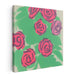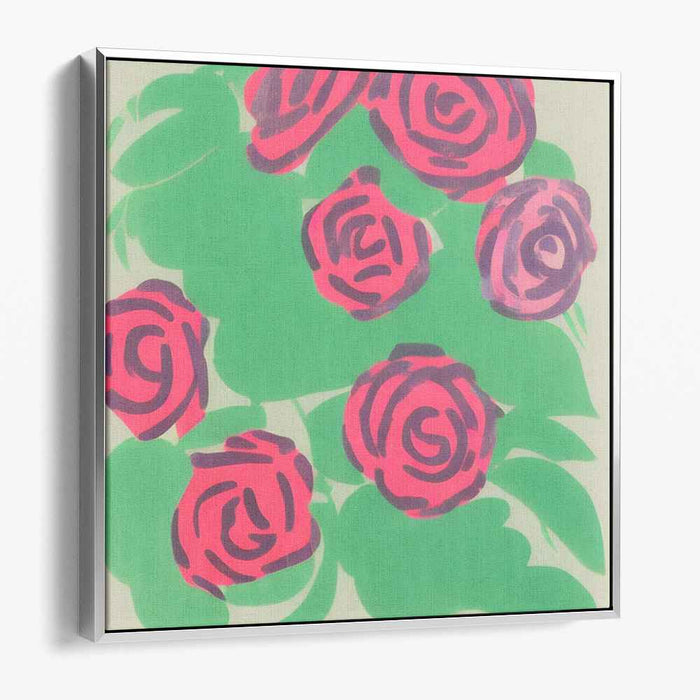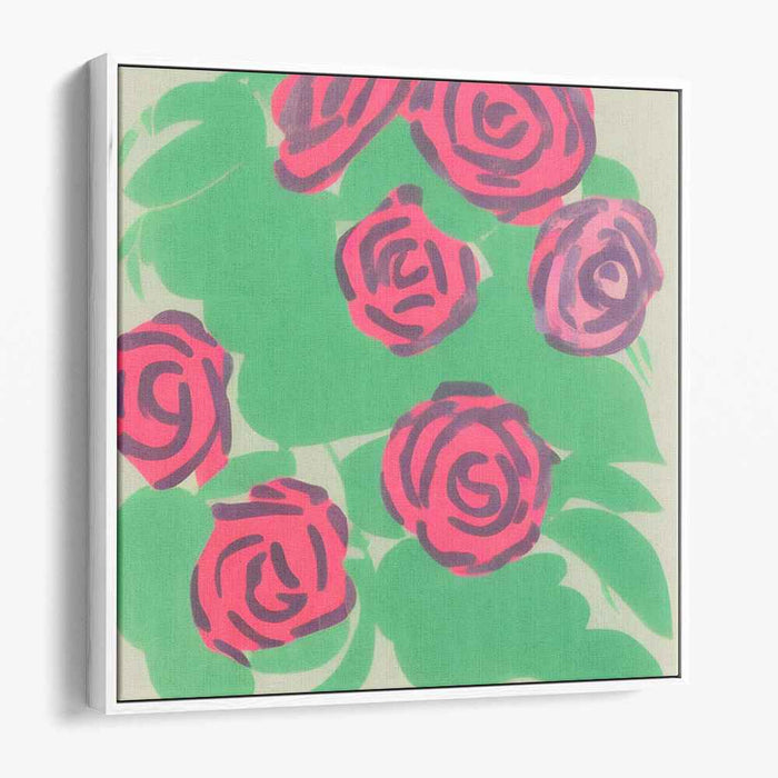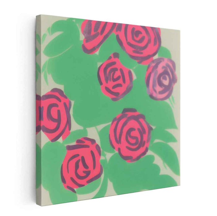 Introducing 'Whimsical Roses,' a vibrant canvas art print that brings a burst of joy and exuberance into any space with its delightful arrangement of stylized roses. This captivating artwork features a series of large, vivid roses in deep magenta and pink hues, standing out against a lush, vibrant green backdrop.
