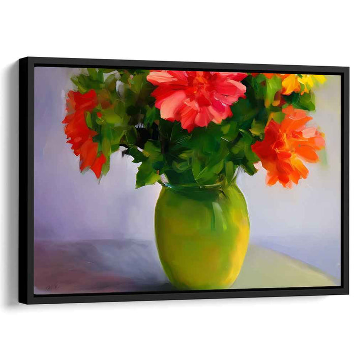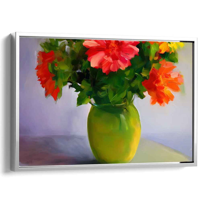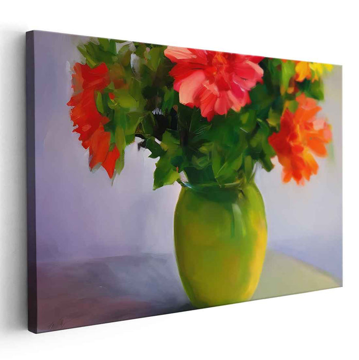 Introducing 'Whispering Blossoms Among Emerald Leaves,' a captivating canvas art that brings a vibrant and lively still life of a bouquet of flowers in a translucent green vase to life. This exquisite artwork radiates freshness and natural beauty, making it a perfect addition to any home or office space seeking a touch of elegance and color.