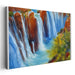 Introducing 'Whispering Cascade Glow: A Luminous Waterfall Landscape,' a captivating canvas art piece that immerses viewers in the breathtaking beauty of a natural waterfall, capturing both its energy and tranquility. This stunning artwork showcases water cascading down rugged cliffs into a serene pool, depicted in vibrant shades of blue and white, creating a visually striking contrast against the warm earth tones of the surrounding cliffs.