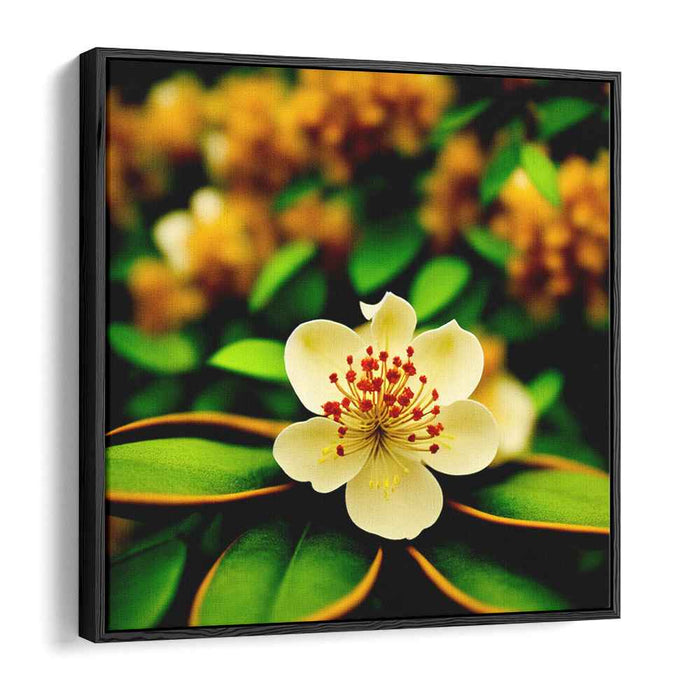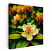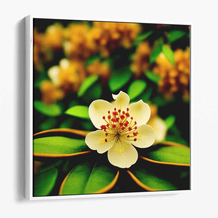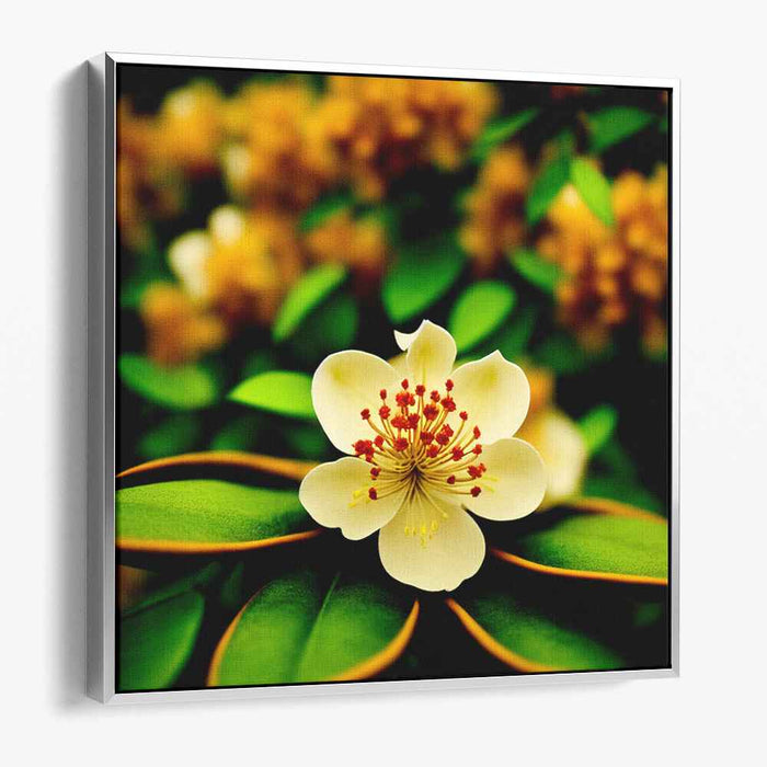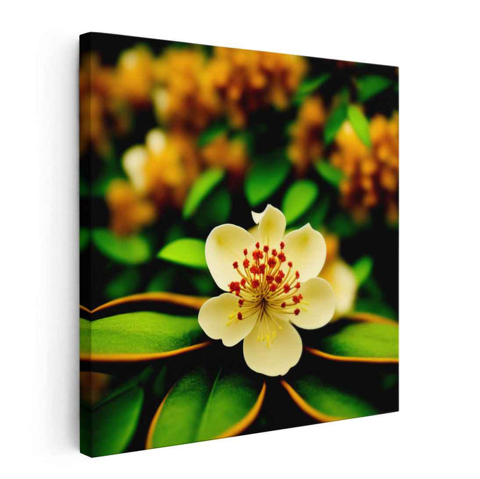 Step into the enchanting world of 'Whispering Moonlit Flora: A Luminous Botanical Portrait,' a mesmerizing canvas art print that encapsulates the sheer elegance of nature's intricate beauty. This captivating artwork showcases a singular, exquisite flower unfurling its delicate petals in a graceful choreography, framed by a backdrop of luxuriant, deep green foliage and soft, blurred blossoms in a golden, sun-kissed palette.