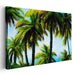Step into the serene tropical oasis of 'Whispering Palms: A Lush Tropical Landscape,' a mesmerizing canvas art print that encapsulates the tranquility of a breezy palm grove under a clear sky. This artwork portrays a cluster of tall, graceful palm trees swaying gently against a vivid blue sky, their leaves painted in a vibrant blend of green and yellow tones, accentuated by hints of dark shadows that infuse depth and contrast, creating a harmoniously lively and calming atmosphere.