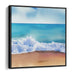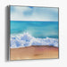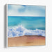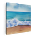 The composition features a stunning gradient of blues, from the deep azure of the ocean to the lighter, crystalline hues where the sea meets the sky. The dynamic white foam of the waves adds a sense of movement and power, contrasting beautifully with the serene horizon that beckons contemplation. Warm earth tones on the sandy beach provide a grounding element, harmonizing with the coolness of the water and enhancing the overall balance of the piece.