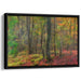 The forest floor is a vibrant tapestry of fallen leaves, painted in rich shades of crimson, gold, and orange, creating a stunning contrast against the lush greens, deep browns, and soft yellows that populate the scene. The artist's masterful use of primary and secondary colors brings depth and dimension to the composition, capturing the essence of the autumn season in all its glory.