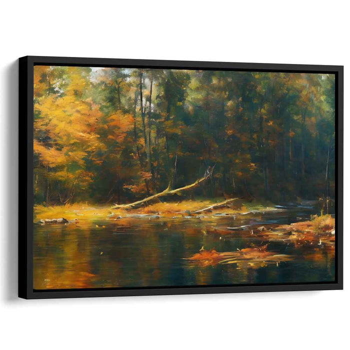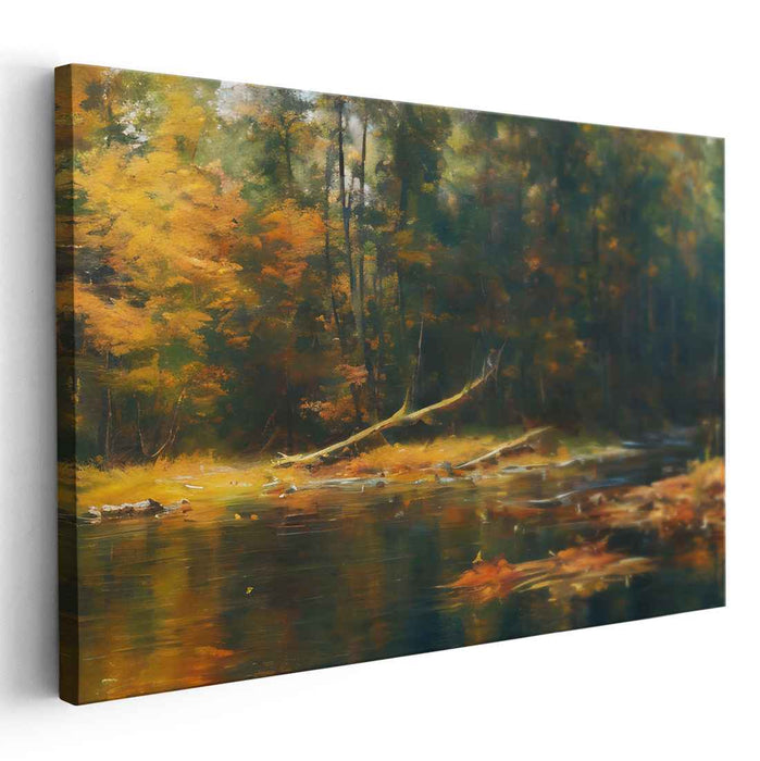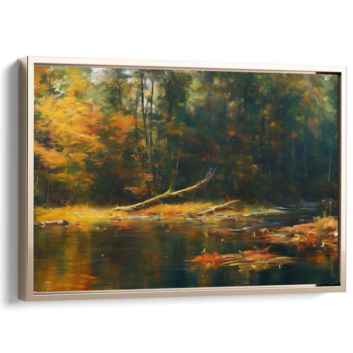 The canvas is awash with warm tones of amber, gold, and russet, capturing the essence of fall's rich tapestry. Deep greens and sporadic hints of blue add depth and contrast, enhancing the overall visual experience. The meticulous attention to detail is evident in the lifelike rendering of leaves, the intricate textures of tree bark, and the gentle ripples on the water's surface.