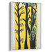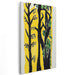 Introducing 'Whispering Woods Language: Expressionist Interpretation of Forest Trees,' a captivating canvas art print that immerses viewers in a unique and evocative portrayal of nature's serene beauty. This artwork showcases a series of elongated trees standing tall, with bold black trunks and branches that starkly contrast the vibrant yellow background. The lively green leaves of the trees inject a burst of life into the composition, creating a dynamic visual experience.