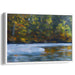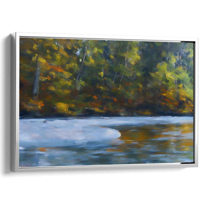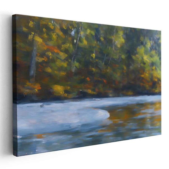Introducing 'Whispers By The Riverbank,' a mesmerizing canvas art print that captures the serene beauty of a forested riverside scene, inviting viewers into a world of tranquility and natural splendor. The artwork focuses on a peaceful river, mirroring the lush greenery and autumnal shades of the dense trees lining its banks.