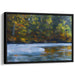 The artist has expertly employed impressionistic techniques to infuse the water with a sense of movement and depth, creating a gentle rippling effect that enhances the scene's realism. The predominant colors in this piece are deep greens and blues, harmoniously complemented by warm oranges and yellows that subtly hint at the changing seasons in the foliage.