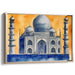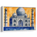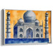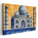Introducing "Whispers Of A Mughal Dream," a captivating canvas art print that beautifully captures the iconic grandeur of the Taj Mahal in a contemporary watercolor style. This artwork immerses viewers in a serene yet vibrant atmosphere, dominated by an ethereal palette of blues and oranges that evoke a sense of majesty and tranquility.