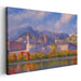 Introducing 'Whispers of Alpine Tranquility,' a mesmerizing canvas art print that transports viewers to a tranquil European cityscape, reminiscent of the charming architecture found in towns like Salzburg, Austria. This exquisite artwork seamlessly blends natural beauty with architectural elegance, framed by majestic mountains bathed in the gentle light of a setting or rising sun.
