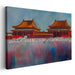 Introducing "Whispers of Imperial Tranquility: Forbidden City Serenity," a mesmerizing canvas art print that transports viewers into the grandeur and mystique of traditional Chinese architecture, reminiscent of the iconic structures found in the Forbidden City. This artwork captures the essence of these architectural marvels with a focus on vibrant reds and rich golds dominating the composition, set against serene misty blues in the background.