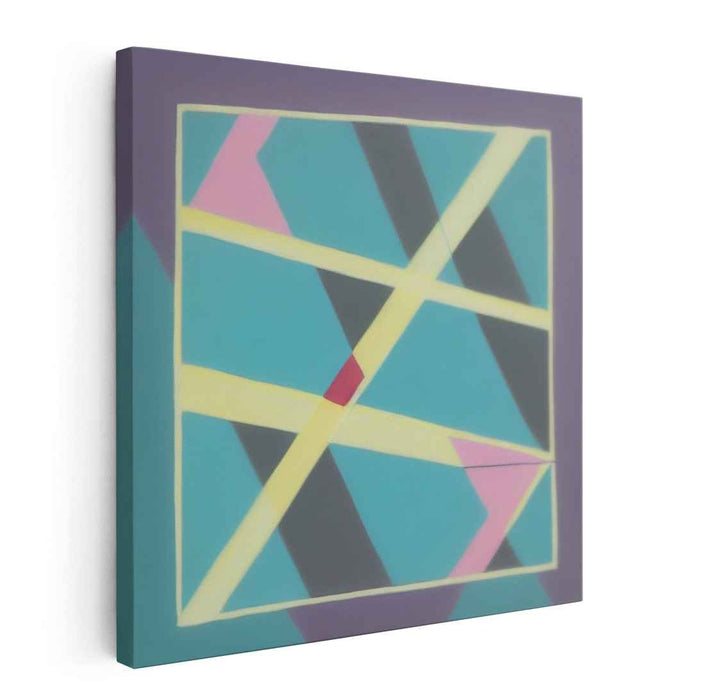 The composition is bordered by a striking yet gentle purple frame, adding depth and contrast to the piece. Within this frame, geometric elements like triangles and parallelograms intersect and overlap, imbuing the artwork with a sense of movement and intricacy. Yellow lines traverse the canvas, introducing brightness and guiding the viewer's gaze through the intricate design. Subtle hints of pink and a lone red shape provide warmth and serve as focal points, beautifully contrasting the cool tones of turquoise and purple.