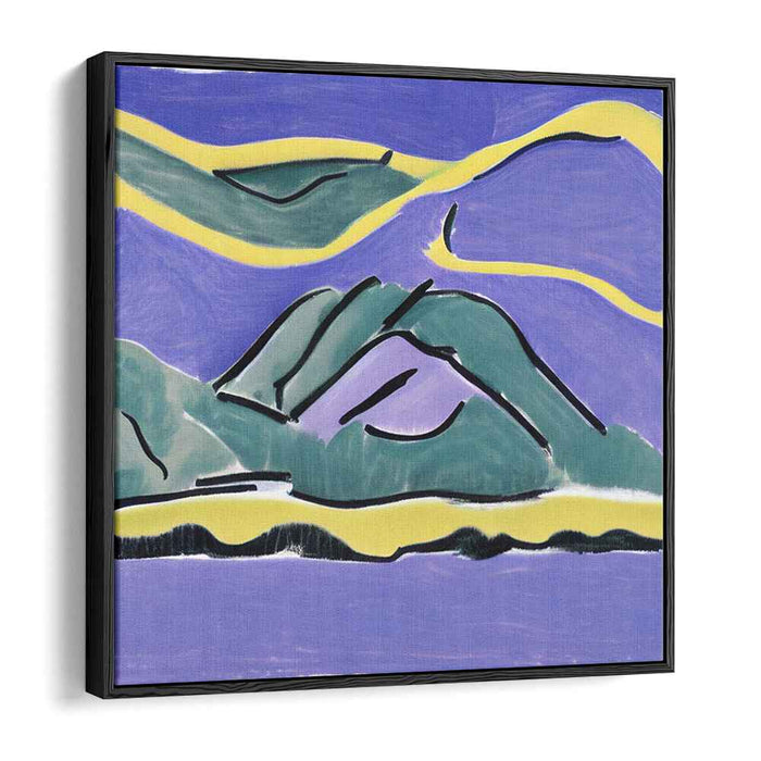 The hills are set against a striking purple sky, embellished with undulating bands of yellow that add a sense of contrast and energy to the piece. The dominant use of primary colors, especially the vibrant purple sky, captures attention and infuses the artwork with a modern and almost surreal quality. Secondary colors like green and yellow provide depth and harmony, creating a visually stimulating and balanced composition.