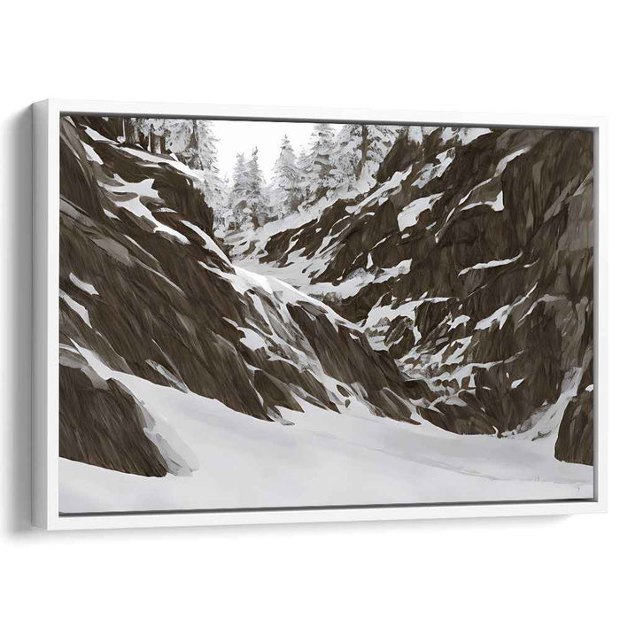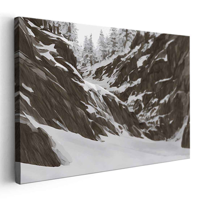 Step into the tranquil beauty of 'Winter's Silence: A Majestic Mountain Landscape,' a mesmerizing canvas art piece that transports you to a serene winter wonderland. This captivating artwork captures the essence of a peaceful snowy day, enveloped by rugged, snow-clad mountains and a pristine white valley.
