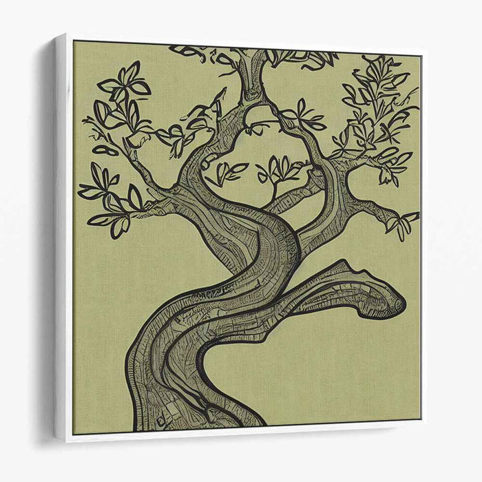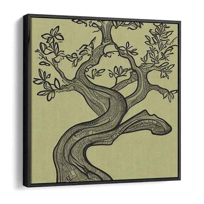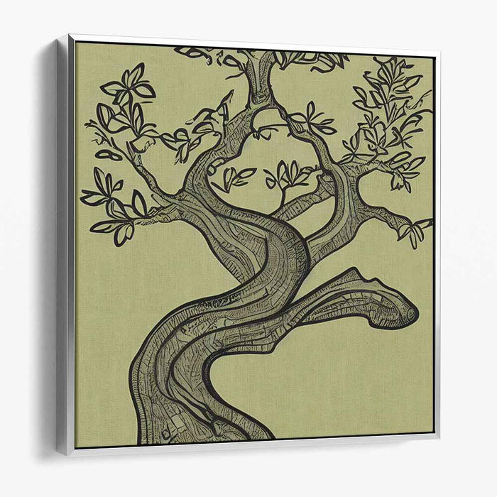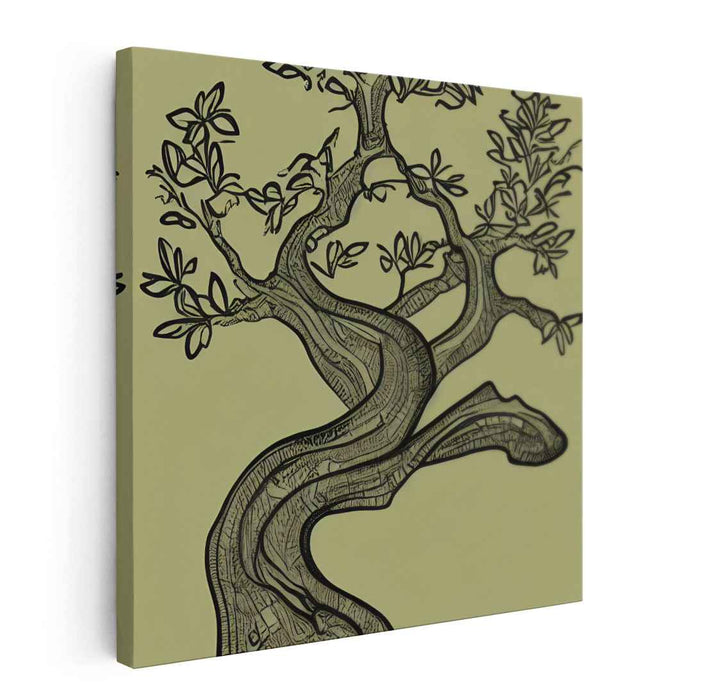 Introducing "Zen Forest Silhouette," a mesmerizing canvas art that intricately portrays a detailed tree with twisting branches elegantly sprawled across the olive-green background. This captivating artwork showcases a network of lines and shapes that simulate the rugged texture of bark, creating a profound and serene presence.